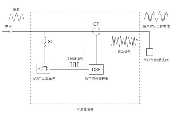 有源濾波器通過CT實時檢測線路電流,并把被檢測到的諧波轉化為數(shù)字信號處理器中的控制信號。同時,數(shù)字信號處理器產(chǎn)生一系列脈寬調制信號,驅動IGBT功率模塊通過線路電抗器向電網(wǎng)輸出相位正好與電網(wǎng)諧波電流方向相反,而幅值大小相等的電流,兩種諧波電流正好相互抵消,從而達到濾除諧波、凈化電網(wǎng)電流的目的。
